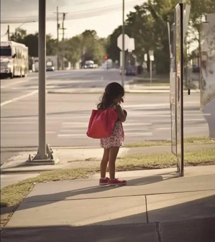 Jednak już pierwszego wieczoru coś niezwykłego przykuło moją uwagę. Gdy słońce zachodziło, zobaczyłem małą dziewczynkę stojącą na przystanku autobusowym po drugiej stronie ulicy naprzeciwko mojego domu. Wyglądała na osobę w wieku około 8 lat i miała na ramieniu małą czerwoną torbę.