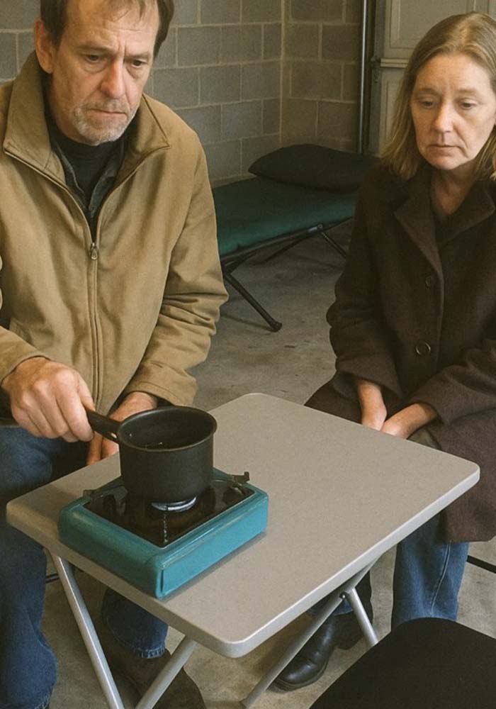 Wyszedłem z domu, jakby strzelił. Poszedłem do garażu, drżąc. Nie wiedziałem, czego szukam. Ale zobaczyłem światło przez boczne okno. Powoli otworzyłem drzwi. I tam byli. Tata na krześle, naprawiając stary zawias. Matka na składanym krześle, ubrana w zimową kurtkę. Składane łóżko w kącie. Piec kempingowy. Stół, dwa krzesła. Aż tak bardzo. Nie mogłem porozmawiać. Po prostu tam zostałem, patrząc. Moja matka wróciła i zobaczyła mnie. „Och,” powiedział powoli. “Moja droga.”