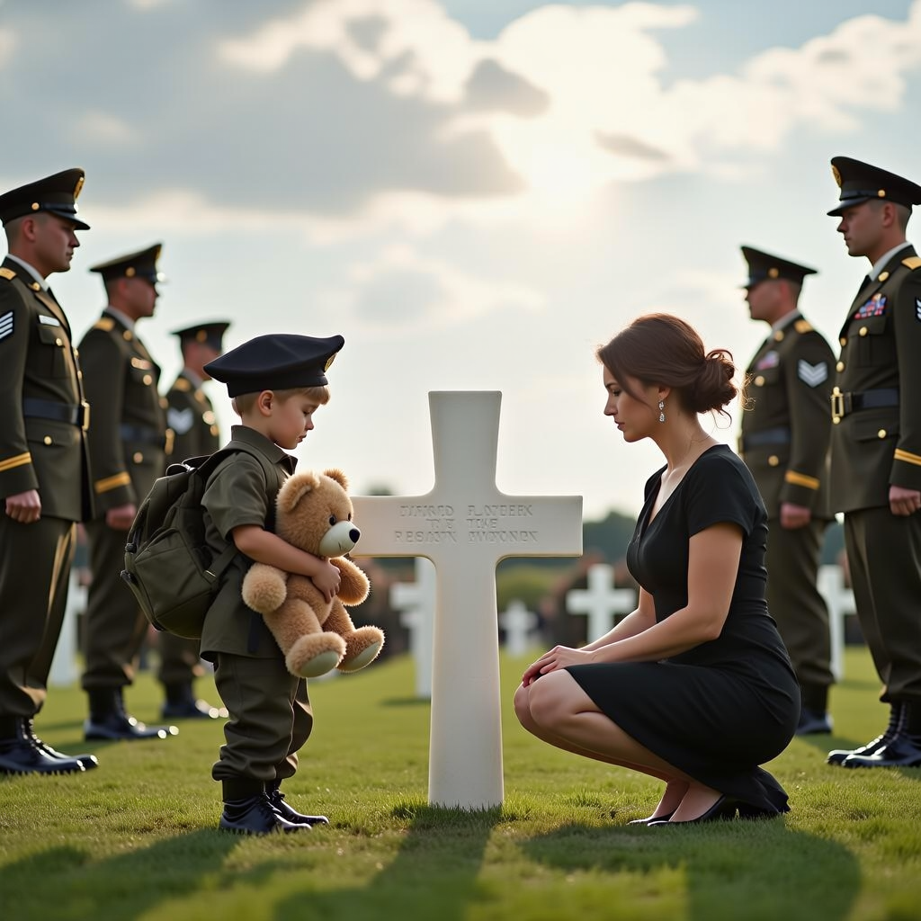 Na cichym cmentarzu wojskowym, z niekończącymi się rzędami idealnie ustawionych białych krzyży, scena zatrzymała czas w miejscu. Mały chłopiec w wieku około 5 lat, ubrany w formalny strój, trzymał w dłoni pluszową zabawkę i w milczeniu wpatrywał się w nagrobek ojca.